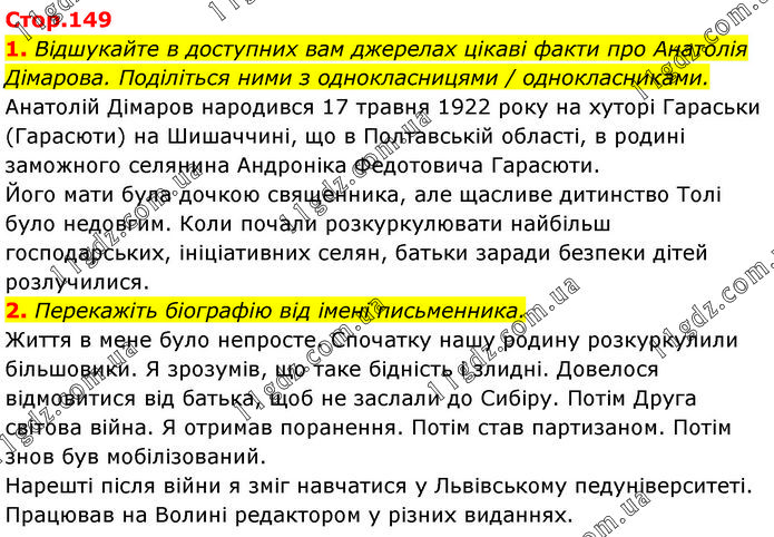 1. Відшукайте в доступних вам джерелах цікаві факти про Анатолія Дімарова. Поділіться ними з однокласницями / однокласниками. Анатолій Дімаров народився 17 травня 1922 року на хуторі Гараськи (Гарасюти) на Шишаччині, що в Полтавській області, в родині заможного селянина Андроніка Федотовича Гарасюти. Його мати була дочкою священника, але щасливе дитинство Толі було недовгим. Коли почали розкуркулювати найбільш господарських, ініціативних селян, батьки заради безпеки дітей розлучилися. 2. Перекажіть біографію від імені письменника. Життя в мене було непросте. Спочатку нашу родину розкуркулили більшовики. Я зрозумів, що таке бідність і злидні. Довелося відмовитися від батька, щоб не заслали до Сибіру. Потім Друга світова війна. Я отримав поранення. Потім став партизаном. Потім знов був мобілізований. Нарешті після війни я зміг навчатися у Львівському педуніверситеті. Працював на Волині редактором у різних виданнях.