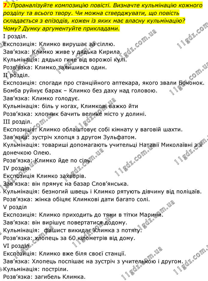 Проаналізуйте композицію повісті. Визначте кульмінацію кожного розділу та всього твору. Чи можна стверджувати, що повість складається з епізодів, кожен із яких має власну кульмінацію? Чому? Думку аргументуйте прикладами. І розділ. Експозиція: Климко вирушає за сіллю. Зав’язка: Климко живе у дядька Кирила. Кульмінація: дядько гине від ворожої кулі. Розв’язка: Климко залишився один. ІІ розділ. Експозиція: спогади про станційного аптекара, якого звали Бочонок. Бомба руйнує барак – Климко без даху над головою. Зав’язка: Климко голодує. Кульмінація: біль у ногах, Климкові важко йти Розв’язка: хлопчик бачить велике місто у долині. ІІІ розділ. Експозиція: Климко облаштовує собі кімнату у ваговій шахти. Зав’язка: зустріч хлопця з другом Зульфатом. Кульмінація: товариші допомагають учительці Наталії Миколаївні з її донечкою Олею. Розв’язка: Климко йде по сіль. ІV розділ. Експозиція Климко захворів. Зав’язка: він прямує на базар Слов’янська. Кульмінація: безногий швець і Климко рятують дівчину від поліцаїв. Розв’язка: жінка обіцяє Климкові дати багато солі. V розділ Експозиція: Климко приходить до тями в тітки Марини. Зав’язка: він вирішує повертатися додому. Кульмінація: фашист викидає Климка з потягу. Розв’язка: хлопець за 60 кілометрів від дому. VІ розділ Експозиція: Климко вже біля своєї станції. Зав’язка: Хлопець поспішає на зустріч з учителькою і другом. Кульмінація: постріли. Розв’язка: загибель Климка.