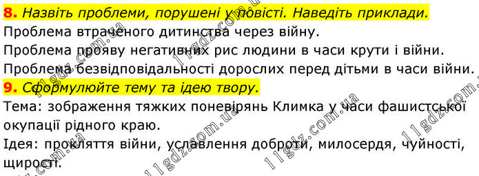 8. Назвіть проблеми, порушені у повісті. Наведіть приклади. Проблема втраченого дитинства через війну. Проблема прояву негативних рис людини в часи крути і війни. Проблема безвідповідальності дорослих перед дітьми в часи війни. 9. Сформулюйте тему та ідею твору. Тема: зображення тяжких поневірянь Климка у часи фашистської окупації рідного краю. Ідея: прокляття війни, уславлення доброти, милосердя, чуйності, щирості.