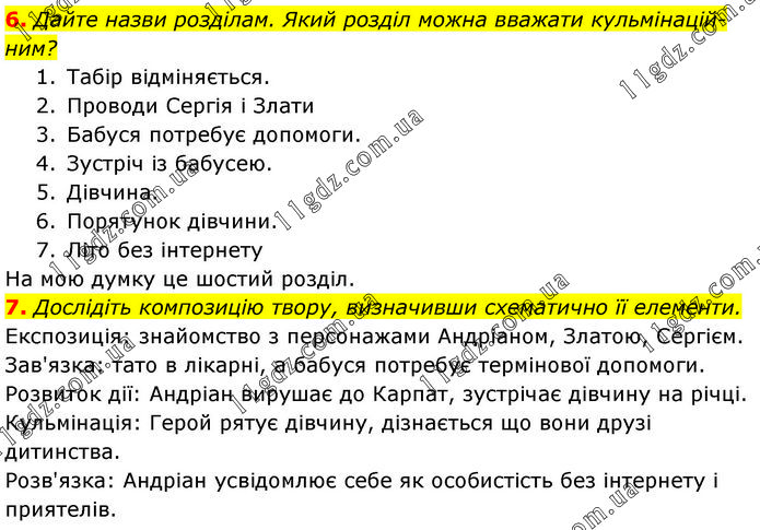 6. Дайте назви розділам. Який розділ можна вважати кульмінацій- ним? 1. Табір відміняється. 2. Проводи Сергія і Злати 3. Бабуся потребує допомоги. 4. Зустріч із бабусею. 5. Дівчина. 6. Порятунок дівчини. 7. Літо без інтернету На мою думку це шостий розділ. 7. Дослідіть композицію твору, визначивши схематично її елементи. Експозиція: знайомство з персонажами Андріаном, Златою, Сергієм. Зав'язка: тато в лікарні, а бабуся потребує термінової допомоги. Розвиток дії: Андріан вирушає до Карпат, зустрічає дівчину на річці. Кульмінація: Герой рятує дівчину, дізнається що вони друзі дитинства. Розв'язка: Андріан усвідомлює себе як особистість без інтернету і приятелів.