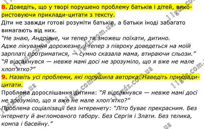 8. Доведіть, що у творі порушено проблему батьків і дітей, вико-ристовуючи приклади-цитати з тексту. Діти не завжди готові розуміти батьків, а батьки іноді забагато вимагають від них. “Не знаю, Андріане, чи тепер ти зможеш поїхати, дитино. Адже лікування дорожезне, і тепер з півроку доведеться на моїй зарплаті протриматися, — сумно сказала мама, втираючи сльози.” “Я відсахнувся — невже мамі досі не зрозуміло, що я вже не мале хлоп’ятко?” 9. Назвіть усі проблеми, які порушила авторка. Наведіть приклади-цитати. Проблема дорослішання дитини: “Я відсахнувся — невже мамі досі не зрозуміло, що я вже не мале хлоп’ятко?” Проблема соціалізації без інтеренету: “Літо буває прекрасним. Без інтернету й англомовного табору. Без Сергія і Злати. Без телика, компа і басейну.”