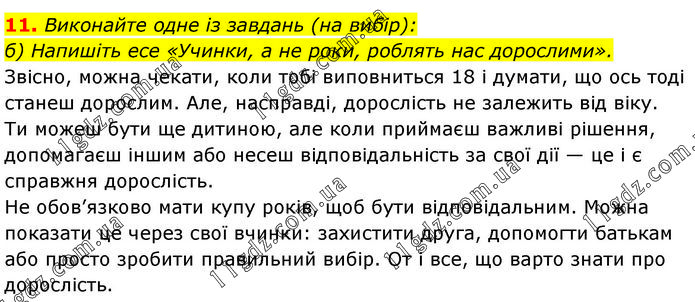 Виконайте одне із завдань (на вибір): б) Напишіть есе «Учинки, а не роки, роблять нас дорослими». Звісно, можна чекати, коли тобі виповниться 18 і думати, що ось тоді станеш дорослим. Але, насправді, дорослість не залежить від віку. Ти можеш бути ще дитиною, але коли приймаєш важливі рішення, допомагаєш іншим або несеш відповідальність за свої дії — це і є справжня дорослість. Не обов’язково мати купу років, щоб бути відповідальним. Можна показати це через свої вчинки: захистити друга, допомогти батькам або просто зробити правильний вибір. От і все, що варто знати про дорослість.