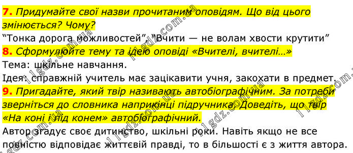 7. Придумайте свої назви прочитаним оповідям. Що від цього змінюється? Чому? “Тонка дорога можливостей”, “Вчити — не волам хвости крутити” 8. Сформулюйте тему та ідею оповіді «Вчителі, вчителі…» Тема: шкільне навчання. Ідея: справжній учитель має зацікавити учня, закохати в предмет. 9. Пригадайте, який твір називають автобіографічним. За потреби зверніться до словника наприкінці підручника. Доведіть, що твір «На коні і під конем» автобіографічний. Автор згадує своє дитинство, шкільні роки. Навіть якщо не все повністю відповідає життєвій правді, то в більшості є з життя автора.