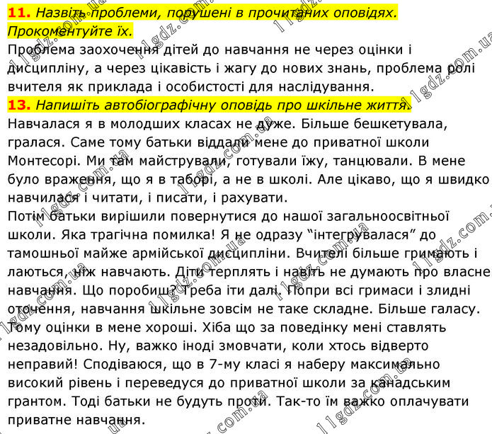 11. Назвіть проблеми, порушені в прочитаних оповідях. Прокоментуйте їх. Проблема заохочення дітей до навчання не через оцінки і дисципліну, а через цікавість і жагу до нових знань, проблема ролі вчителя як приклада і особистості для наслідування. 13. Напишіть автобіографічну оповідь про шкільне життя. Навчалася я в молодших класах не дуже. Більше бешкетувала, гралася. Саме тому батьки віддали мене до приватної школи Монтесорі. Ми там майстрували, готували їжу, танцювали. В мене було враження, що я в таборі, а не в школі. Але цікаво, що я швидко навчилася і читати, і писати, і рахувати. Потім батьки вирішили повернутися до нашої загальноосвітньої школи. Яка трагічна помилка! Я не одразу “інтегрувалася” до тамошньої майже армійської дисципліни. Вчителі більше гримають і лаються, ніж навчають. Діти терплять і навіть не думають про власне навчання. Що поробиш? Треба іти далі. Попри всі гримаси і злидні оточення, навчання шкільне зовсім не таке складне. Більше галасу. Тому оцінки в мене хороші. Хіба що за поведінку мені ставлять незадовільно. Ну, важко іноді змовчати, коли хтось відверто неправий! Сподіваюся, що в 7-му класі я наберу максимально високий рівень і переведуся до приватної школи за канадським грантом. Тоді батьки не будуть проти. Так-то їм важко оплачувати приватне навчання.