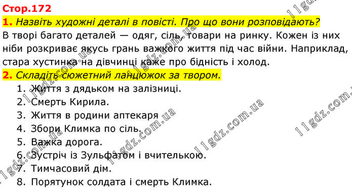 1. Назвіть художні деталі в повісті. Про що вони розповідають? В творі багато деталей — одяг, сіль, товари на ринку. Кожен із них ніби розкриває якусь грань важкого життя під час війни. Наприклад, стара хустинка на дівчинці каже про бідність і холод. 2. Складіть сюжетний ланцюжок за твором. 1. Життя з дядьком на залізниці. 2. Смерть Кирила. 3. Життя в родини аптекаря 4. Збори Климка по сіль. 5. Важка дорога. 6. Зустріч із Зульфатом і вчителькою. 7. Тимчасовий дім. 8. Порятунок солдата і смерть Климка.
