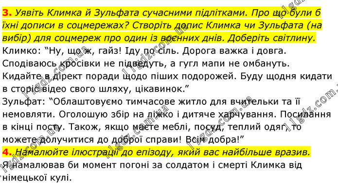 3. Уявіть Климка й Зульфата сучасними підлітками. Про що були б їхні дописи в соцмережах? Створіть допис Климка чи Зульфата (на вибір) для соцмереж про один із воєнних днів. Доберіть світлину. Климко: “Ну, що ж, гайз! Іду по сіль. Дорога важка і довга. Сподіваюсь кросівки не підведуть, а гугл мапи не омбануть. Кидайте в дірект поради щодо піших подорожей. Буду щодня кидати в сторіс відео свого шляху, цікавинок.” Зульфат: “Облаштовуємо тимчасове житло для вчительки та її немовляти. Оголошую збір на ліжко і дитяче харчування. Посилання в кінці посту. Також, якщо маєте меблі, посуд, теплий одяг, то можете долучитися до доброї справи! Всім добра!” 4. Намалюйте ілюстрації до епізоду, який вас найбільше вразив. Я намалював би момент погоні за солдатом і смерті Климка від німецької кулі.
