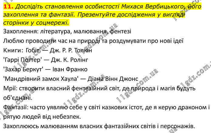 Дослідіть становлення особистості Михася Вербицького, його захоплення та фантазії. Презентуйте дослідження у вигляді сторінки у соцмережі. Захоплення: література, малювання, фентезі Люблю проводити час на природі та роздумувати про нові ідеї Книги: Гобіт' — Дж. Р. Р. Толкін 'Гаррі Поттер' — Дж. К. Ролінг 'Захар Беркут' — Іван Франко 'Мандрівний замок Хаула' — Діана Вінн Джонс Мрії: створити власний фентезійний світ, де природа і магія будуть об'єднані. Фантазії: часто уявляю себе у світі казкових істот, де я керую драконом і рятую людей від небезпек. Захоплююсь малюванням власних фантазійних світів і персонажів.