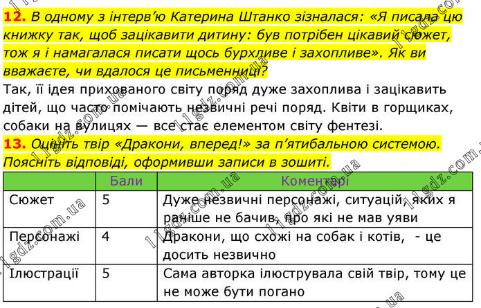 12. В одному з інтерв’ю Катерина Штанко зізналася: «Я писала цю книжку так, щоб зацікавити дитину: був потрібен цікавий сюжет, тож я і намагалася писати щось бурхливе і захопливе». Як ви вважаєте, чи вдалося це письменниці? Так, її ідея прихованого світу поряд дуже захоплива і зацікавить дітей, що часто помічають незвичні речі поряд. Квіти в горщиках, собаки на вулицях — все стає елементом світу фентезі. 13. Оцініть твір «Дракони, вперед!» за п’ятибальною системою. Поясніть відповіді, оформивши записи в зошиті.