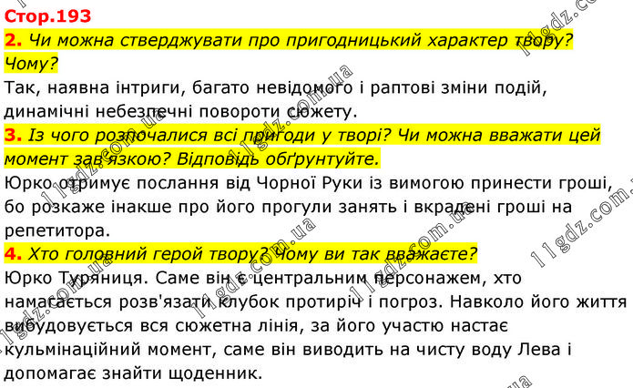 2. Чи можна стверджувати про пригодницький характер твору? Чому? Так, наявна інтриги, багато невідомого і раптові зміни подій, динамічні небезпечні повороти сюжету. 3. Із чого розпочалися всі пригоди у творі? Чи можна вважати цей момент зав’язкою? Відповідь обґрунтуйте. Юрко отримує послання від Чорної Руки із вимогою принести гроші, бо розкаже інакше про його прогули занять і вкрадені гроші на репетитора. 4. Хто головний герой твору? Чому ви так вважаєте? Юрко Туряниця. Саме він є центральним персонажем, хто намагається розв'язати клубок протиріч і погроз. Навколо його життя вибудовується вся сюжетна лінія, за його участю настає кульмінаційний момент, саме він виводить на чисту воду Лева і допомагає знайти щоденник.