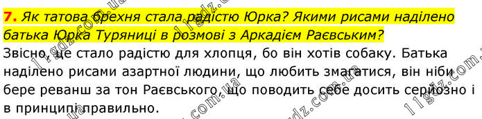 Як татова брехня стала радістю Юрка? Якими рисами наділено батька Юрка Туряниці в розмові з Аркадієм Раєвським? Звісно, це стало радістю для хлопця, бо він хотів собаку. Батька наділено рисами азартної людини, що любить змагатися, він ніби бере реванш за тон Раєвського, що поводить себе досить серйозно і в принципі правильно.
