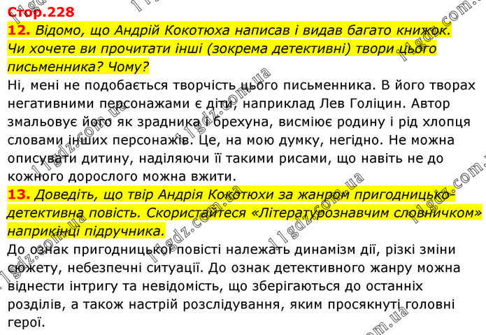 12. Відомо, що Андрій Кокотюха написав і видав багато книжок. Чи хочете ви прочитати інші (зокрема детективні) твори цього письменника? Чому? Ні, мені не подобається творчість цього письменника. В його творах негативними персонажами є діти, наприклад Лев Голіцин. Автор змальовує його як зрадника і брехуна, висміює родину і рід хлопця словами інших персонажів. Це, на мою думку, негідно. Не можна описувати дитину, наділяючи її такими рисами, що навіть не до кожного дорослого можна вжити. 13. Доведіть, що твір Андрія Кокотюхи за жанром пригодницько- детективна повість. Скористайтеся «Літературознавчим словничком» наприкінці підручника. До ознак пригодницької повісті належать динамізм дії, різкі зміни сюжету, небезпечні ситуації. До ознак детективного жанру можна віднести інтригу та невідомість, що зберігаються до останніх розділів, а також настрій розслідування, яким просякнуті головні герої.