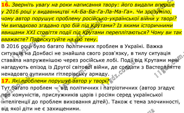 16. Зверніть увагу на роки написання твору: його видали вперше у 2016 році у видавництві «А-Ба-Ба-Га-Ла-Ма-Га». Чи зрозуміло, чому автор порушує проблему російсько-української війни у творі? Чи випадково згадано про бій під Крутами? Із якими історичними явищами ХХІ століття події під Крутами переплітаються? Чому ви так вважаєте? Подискутуйте на цю тему. В 2016 році було багато політичних проблем в Україні. Важка ситуація на Донбасі не знайшла свого розв'язку, в тилу ситуація ставала напруженішою через російське лобі. Події під Крутами мені нагадують епізод із Другої світової війни, де солдати з Вастерплятте ненадовго зупинили гітлерівську армаду. 17. Які проблеми порушує автор у творі? Тут багато проблем — від політичних і патріотичних (автор згадує про комуністів, прислужників царів і росіян серед української інтелігенції до проблем виховання дітей). Також є тема злочинності, від якої діти не є захищеними.