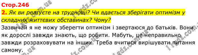 2. Як ви реагуєте на труднощі? Чи вдається зберігати оптимізм у складних життєвих обставинах? Чому? Зазвичай я не можу зберегти оптимізм і звертаюся до батьків. Вони як дорослі завжди знають, що робити. Мабуть, це неправильно завжди розраховувати на інших. Треба вчитися вирішувати питання самому.