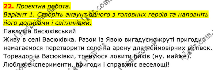 Проєктна робота. Варіант 1. Створіть акаунт одного з головних героїв та наповніть його дописами і світлинами. Павлуша Васюківський Живу в селі Васюківка. Разом із Явою вигадуємо круті пригоди і намагаємося перетворити село на арену для неймовірних витівок. Тореадор із Васюківки, тренуюся ловити биків (ну, майже). Люблю експерименти, пригоди і справжнє веселощі!