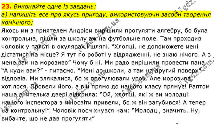 Виконайте одне із завдань: а) напишіть есе про якусь пригоду, використовуючи засоби творення комічного; Якось ми з приятелем Андрієм вирішили прогуляти алгебру, бо була контрольна, пішли за школу аж на футбольне поле. Там проходив чоловік у пальті в окулярах і шляпі. “Хлопці, не допоможете мені дістатися на місце? Я тут по роботі у відрядженні, не знаю нічого. А з мене вам на морозиво” Чому б ні. Ми радо вирішили провести пана. “А куди вам?” - питаємо. “Мені до школи, а там на другий поверх” - відповів. Ми злякалися, бо ж прогулювали урок. Але морозива хотілося. Провели його, а він прямо до нашого класу прямує! Раптом наша вчителька двері відкрила: “Ой, хлопці, які ж ви молодці: нашого інспектора з міносвіти привели, бо ж він загубився! А тепер на контрольну!”. Чоловік посміхнувся нам: “Молодці, значить. Ну, вибачте, що не дав прогуляти”