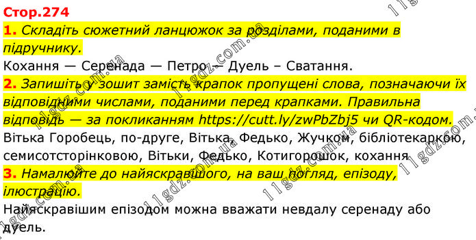 1. Складіть сюжетний ланцюжок за розділами, поданими в підручнику. Кохання — Серенада — Петро — Дуель – Сватання. 2. Запишіть у зошит замість крапок пропущені слова, позначаючи їх відповідними числами, поданими перед крапками. Правильна відповідь — за покликанням https://cutt.ly/zwPbZbj5 чи QR-кодом. Вітька Горобець, по-друге, Вітька, Федько, Жучком, бібліотекаркою, семисотсторінковою, Вітьки, Федько, Котигорошок, кохання 3. Намалюйте до найяскравішого, на ваш погляд, епізоду, ілюстрацію. Найяскравішим епізодом можна вважати невдалу серенаду або дуель.