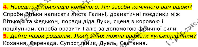 4. Наведіть 5 прикладів комічного. Які засоби комічного вам відомі? Спроби Вітьки написати листа Галині, драматичні поєдинки між Вітькою та Федьком, поради діда Луки, сцена з коровою і поцілунком, спроба вразити Галю за допомогою фізичної сили 5. Дайте назви розділам. Який з них можна вважати кульмінаційним? Кохання, Серенада, Супротивник, Дуель, Сватання.