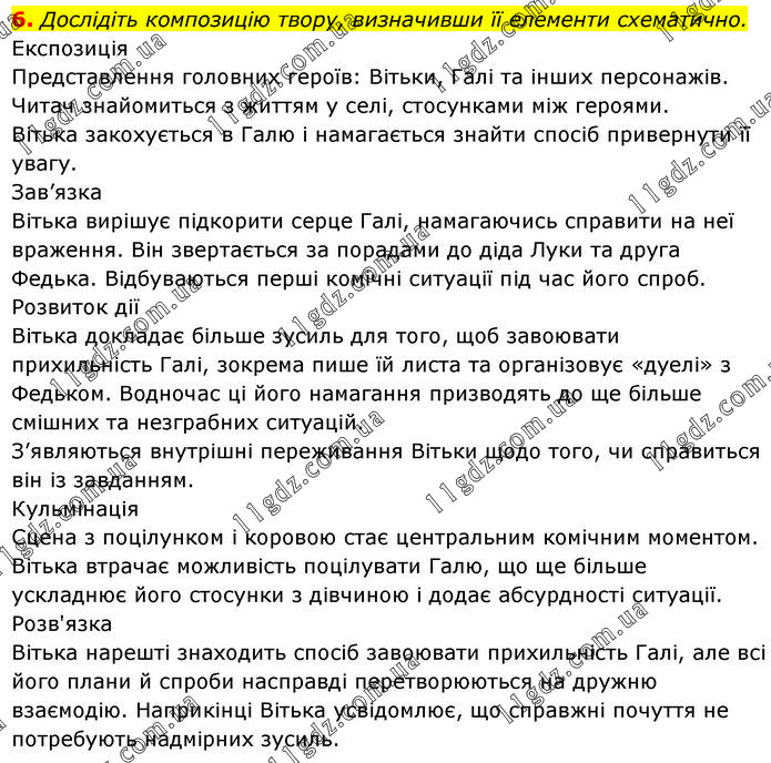 Дослідіть композицію твору, визначивши її елементи схематично. Експозиція Представлення головних героїв: Вітьки, Галі та інших персонажів. Читач знайомиться з життям у селі, стосунками між героями. Вітька закохується в Галю і намагається знайти спосіб привернути її увагу. Зав’язка Вітька вирішує підкорити серце Галі, намагаючись справити на неї враження. Він звертається за порадами до діда Луки та друга Федька. Відбуваються перші комічні ситуації під час його спроб. Розвиток дії Вітька докладає більше зусиль для того, щоб завоювати прихильність Галі, зокрема пише їй листа та організовує «дуелі» з Федьком. Водночас ці його намагання призводять до ще більше смішних та незграбних ситуацій. З’являються внутрішні переживання Вітьки щодо того, чи справиться він із завданням. Кульмінація Сцена з поцілунком і коровою стає центральним комічним моментом. Вітька втрачає можливість поцілувати Галю, що ще більше ускладнює його стосунки з дівчиною і додає абсурдності ситуації. Розв'язка Вітька нарешті знаходить спосіб завоювати прихильність Галі, але всі його плани й спроби насправді перетворюються на дружню взаємодію. Наприкінці Вітька усвідомлює, що справжні почуття не потребують надмірних зусиль.