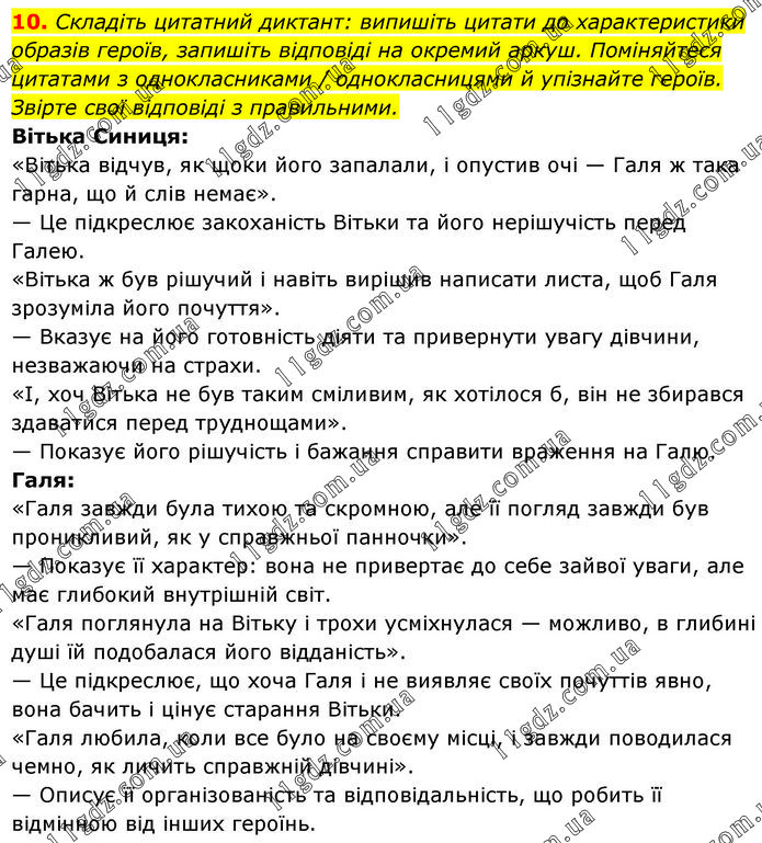 Складіть цитатний диктант: випишіть цитати до характеристики образів героїв, запишіть відповіді на окремий аркуш. Поміняйтеся цитатами з однокласниками / однокласницями й упізнайте героїв. Звірте свої відповіді з правильними. Вітька Синиця: «Вітька відчув, як щоки його запалали, і опустив очі — Галя ж така гарна, що й слів немає». — Це підкреслює закоханість Вітьки та його нерішучість перед Галею. «Вітька ж був рішучий і навіть вирішив написати листа, щоб Галя зрозуміла його почуття». — Вказує на його готовність діяти та привернути увагу дівчини, незважаючи на страхи. «І, хоч Вітька не був таким сміливим, як хотілося б, він не збирався здаватися перед труднощами». — Показує його рішучість і бажання справити враження на Галю. Галя: «Галя завжди була тихою та скромною, але її погляд завжди був проникливий, як у справжньої панночки». — Показує її характер: вона не привертає до себе зайвої уваги, але має глибокий внутрішній світ. «Галя поглянула на Вітьку і трохи усміхнулася — можливо, в глибині душі їй подобалася його відданість». — Це підкреслює, що хоча Галя і не виявляє своїх почуттів явно, вона бачить і цінує старання Вітьки. «Галя любила, коли все було на своєму місці, і завжди поводилася чемно, як личить справжній дівчині». — Описує її організованість та відповідальність, що робить її відмінною від інших героїнь.