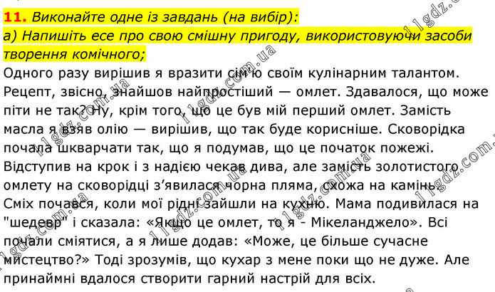 Виконайте одне із завдань (на вибір): а) Напишіть есе про свою смішну пригоду, використовуючи засоби творення комічного; Одного разу вирішив я вразити сім'ю своїм кулінарним талантом. Рецепт, звісно, знайшов найпростіший — омлет. Здавалося, що може піти не так? Ну, крім того, що це був мій перший омлет. Замість масла я взяв олію — вирішив, що так буде корисніше. Сковорідка почала шкварчати так, що я подумав, що це початок пожежі. Відступив на крок і з надією чекав дива, але замість золотистого омлету на сковорідці з’явилася чорна пляма, схожа на камінь. Сміх почався, коли мої рідні зайшли на кухню. Мама подивилася на "шедевр" і сказала: «Якщо це омлет, то я - Мікеланджело». Всі почали сміятися, а я лише додав: «Може, це більше сучасне мистецтво?» Тоді зрозумів, що кухар з мене поки що не дуже. Але принаймні вдалося створити гарний настрій для всіх.