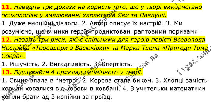 11. Наведіть три докази на користь того, що у творі використано психологізм у змалюванні характерів Яви та Павлуші. 1. Дуже емоційні діалоги. 2. Автор описує їх настрій. 3. Ми розуміємо, що вчинки героїв продиктовані раптовими поривами. 12. Назвіть три риси, які є спільними для героїв повісті Всеволода Нестайка «Тореадори з Васюківки» та Марка Твена «Пригоди Тома Соєра». 1. Рішучість. 2. Вигадливість. 3. Впертість. 13. Відшукайте 4 приклади комічного у творі. 1. Свиня впала в “метро”. 2. Корова стала биком. 3. Хлопці замість кориди ховалися від корови в ковбані. 4. З учительки математики хотіли брати ад 3 копійки за проїзд.