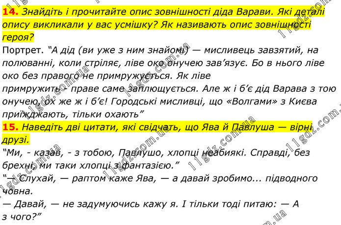 14. Знайдіть і прочитайте опис зовнішності діда Варави. Які деталі опису викликали у вас усмішку? Як називають опис зовнішності героя? Портрет. “А дід (ви уже з ним знайомі) — мисливець завзятий, на полюванні, коли стріляє, ліве око онучею зав’язує. Бо в нього ліве око без правого не примружується. Як ліве примружить - праве саме заплющується. Але ж і б’є дід Варава з тою онучею, ох же ж і б’є! Городські мисливці, що «Волгами» з Києва приїжджають, тільки охають” 15. Наведіть дві цитати, які свідчать, що Ява й Павлуша — вірні друзі. “Ми, - казав, - з тобою, Павлушо, хлопці неабиякі. Справді, без брехні, ми таки хлопці з фантазією.” “— Слухай, — раптом каже Ява, — а давай зробимо... підводного човна. — Давай, — не задумуючись кажу я. І тільки тоді питаю: — А з чого?”