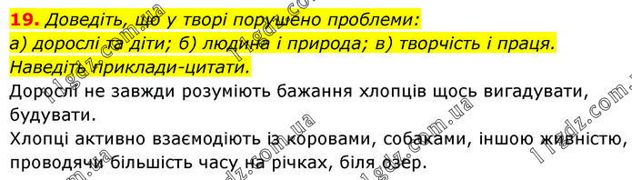 19. Доведіть, що у творі порушено проблеми: а) дорослі та діти; б) людина і природа; в) творчість і праця. Наведіть приклади-цитати. Дорослі не завжди розуміють бажання хлопців щось вигадувати, будувати. Хлопці активно взаємодіють із коровами, собаками, іншою живністю, проводячи більшість часу на річках, біля озер.