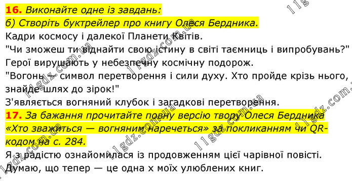 16. Виконайте одне із завдань: б) Створіть буктрейлер про книгу Олеся Бердника. Кадри космосу і далекої Планети Квітів. "Чи зможеш ти віднайти свою істину в світі таємниць і випробувань?" Герої вирушають у небезпечну космічну подорож. "Вогонь — символ перетворення і сили духу. Хто пройде крізь нього, знайде шлях до зірок!" З'являється вогняний клубок і загадкові перетворення. 17. За бажання прочитайте повну версію твору Олеся Бердника «Хто зважиться — вогняним наречеться» за покликанням чи QR-кодом на с. 284. Я з радістю ознайомилася із продовженням цієї чарівної повісті. Думаю, що тепер — це одна х моїх улюблених книг.