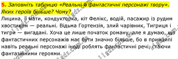 5. Заповніть таблицю «Реальні й фантастичні персонажі твору». Яких героїв більше? Чому? Лицина, її мати, кондукторка, кіт Фелікс, водій, пасажир із рудим хвостиком — реальні. Відьма Гортензія, злий чарівник, Тигриця і тигри — вигадані. Хоча це лише початок роману, але я думаю, що фантастичних персонажів має бути значно більше, бо в принципі навіть реальні персонажі іноді роблять фантастичні речі, стаючи фантазійними героями.