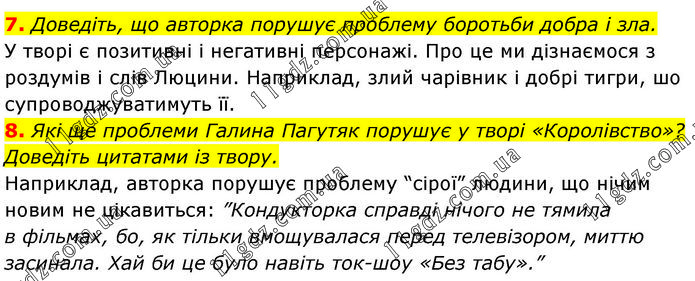 7. Доведіть, що авторка порушує проблему боротьби добра і зла. У творі є позитивні і негативні персонажі. Про це ми дізнаємося з роздумів і слів Люцини. Наприклад, злий чарівник і добрі тигри, шо супроводжуватимуть її. 8. Які ще проблеми Галина Пагутяк порушує у творі «Королівство»? Доведіть цитатами із твору. Наприклад, авторка порушує проблему “сірої” людини, що нічим новим не цікавиться: ”Кондукторка справді нічого не тямила в фільмах, бо, як тільки вмощувалася перед телевізором, миттю засинала. Хай би це було навіть ток-шоу «Без табу».”