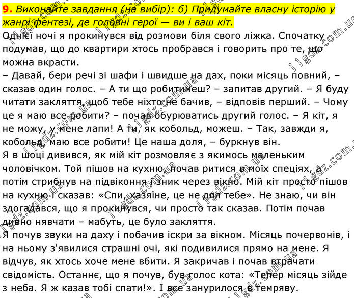 Виконайте завдання (на вибір): б) Придумайте власну історію у жанрі фентезі, де головні герої — ви і ваш кіт. Однієї ночі я прокинувся від розмови біля свого ліжка. Спочатку подумав, що до квартири хтось пробрався і говорить про те, що можна вкрасти. – Давай, бери речі зі шафи і швидше на дах, поки місяць повний, – сказав один голос. – А ти що робитимеш? – запитав другий. – Я буду читати закляття, щоб тебе ніхто не бачив, – відповів перший. – Чому це я маю все робити? – почав обурюватись другий голос. – Я кіт, я не можу, у мене лапи! А ти, як кобольд, можеш. – Так, завжди я, кобольд, маю все робити! Це наша доля, – буркнув він. Я в шоці дивився, як мій кіт розмовляє з якимось маленьким чоловічком. Той пішов на кухню, почав ритися в моїх спеціях, а потім стрибнув на підвіконня і зник через вікно. Мій кіт просто пішов на кухню і сказав: «Спи, хазяїне, це не для тебе». Не знаю, чи він здогадався, що я прокинувся, чи просто так сказав. Потім почав дивно нявчати – мабуть, це було закляття. Я почув звуки на даху і побачив іскри за вікном. Місяць почервонів, і на ньому з'явилися страшні очі, які подивилися прямо на мене. Я відчув, як хтось хоче мене вбити. Я закричав і почав втрачати свідомість. Останнє, що я почув, був голос кота: «Тепер місяць зійде з неба. Я ж казав тобі спати!». І все занурилося в темряву.