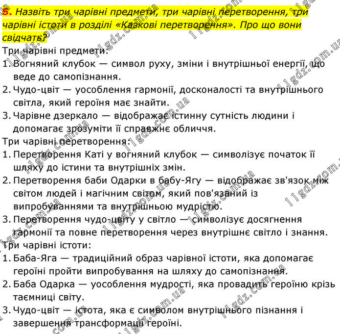 Назвіть три чарівні предмети, три чарівні перетворення, три чарівні істоти в розділі «Казкові перетворення». Про що вони свідчать? Три чарівні предмети: 1. Вогняний клубок — символ руху, зміни і внутрішньої енергії, що веде до самопізнання. 2. Чудо-цвіт — уособлення гармонії, досконалості та внутрішнього світла, який героїня має знайти. 3. Чарівне дзеркало — відображає істинну сутність людини і допомагає зрозуміти її справжнє обличчя. Три чарівні перетворення: 1. Перетворення Каті у вогняний клубок — символізує початок її шляху до істини та внутрішніх змін. 2. Перетворення баби Одарки в бабу-Ягу — відображає зв'язок між світом людей і магічним світом, який пов'язаний із випробуваннями та внутрішньою мудрістю. 3. Перетворення чудо-цвіту у світло — символізує досягнення гармонії та повне перетворення через внутрішнє світло і знання. Три чарівні істоти: 1. Баба-Яга — традиційний образ чарівної істоти, яка допомагає героїні пройти випробування на шляху до самопізнання. 2. Баба Одарка — уособлення мудрості, яка провадить героїню крізь таємниці світу. 3. Чудо-цвіт — істота, яка є символом внутрішнього пізнання і завершення трансформації героїні.