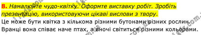 Намалюйте чудо-квітку. Оформте виставку робіт. Зробіть презентацію, використовуючи цікаві вислови з твору. Це може бути квітка з кількома різними бутонами різних рослин. Вранці вона співає наче птах, а вночі світиться різними кольорами.