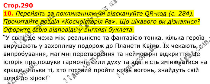 Перейдіть за покликанням чи відскануйте QR-код (с. 284). Прочитайте розділ «Космоісторія Ра». Що цікавого ви дізналися? Оформте свою відповідь у вигляді буклета. “У світі, де межа між реальністю та фантазією тонка, кілька героїв вирушають у захопливу подорож до Планети Квітів. Їх чекають випробування, магічні перетворення та неймовірні відкриття. Це історія про пошуки гармонії, сили духу та здатність змінюватися на краще. Тільки ті, хто готовий пройти крізь вогонь, знайдуть свій шлях до зірок!“