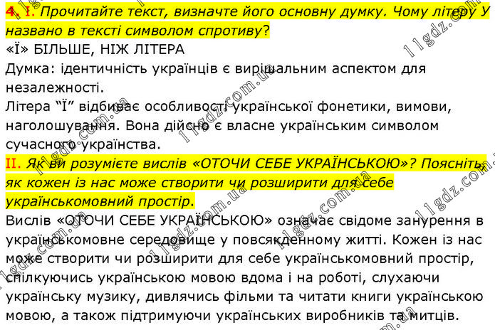 І. Прочитайте текст, визначте його основну думку. Чому літеру У названо в тексті символом спротиву? «Ї» БІЛЬШЕ, НІЖ ЛІТЕРА Думка: ідентичність українців є вирішальним аспектом для незалежності. Літера “Ї” відбиває особливості української фонетики, вимови, наголошування. Вона дійсно є власне українським символом сучасного українства. ІІ. Як ви розумієте вислів «ОТОЧИ СЕБЕ УКРАЇНСЬКОЮ»? Поясніть, як кожен із нас може створити чи розширити для себе українськомовний простір. Вислів «ОТОЧИ СЕБЕ УКРАЇНСЬКОЮ» означає свідоме занурення в українськомовне середовище у повсякденному житті. Кожен із нас може створити чи розширити для себе українськомовний простір, спілкуючись українською мовою вдома і на роботі, слухаючи українську музику, дивлячись фільми та читати книги українською мовою, а також підтримуючи українських виробників та митців.