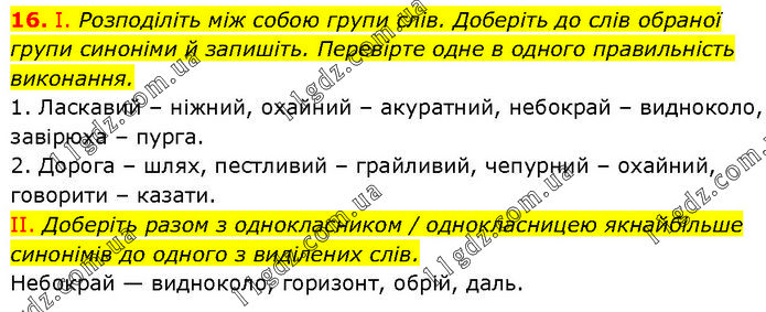 І. Розподіліть між собою групи слів. Доберіть до слів обраної групи синоніми й запишіть. Перевірте одне в одного правильність виконання. 1. Ласкавий – ніжний, охайний – акуратний, небокрай – видноколо, завірюха – пурга. 2. Дорога – шлях, пестливий – грайливий, чепурний – охайний, говорити – казати. II. Доберіть разом з однокласником / однокласницею якнайбільше синонімів до одного з виділених слів. Небокрай — видноколо, горизонт, обрій, даль.
