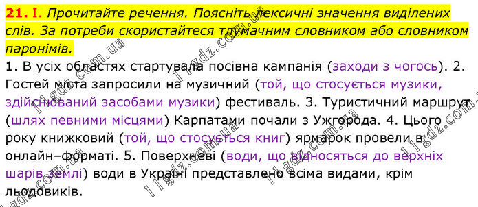 І. Прочитайте речення. Поясніть лексичні значення виділених слів. За потреби скористайтеся тлумачним словником або словником паронімів. 1. В усіх областях стартувала посівна кампанія (заходи з чогось). 2. Гостей міста запросили на музичний (той, що стосується музики, здійснюваний засобами музики) фестиваль. 3. Туристичний маршрут (шлях певними місцями) Карпатами почали з Ужгорода. 4. Цього року книжковий (той, що стосується книг) ярмарок провели в онлайн–форматі. 5. Поверхневі (води, що відносяться до верхніх шарів землі) води в Україні представлено всіма видами, крім льодовиків.