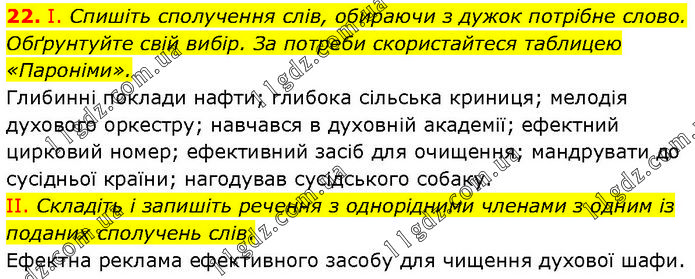 І. Спишіть сполучення слів, обираючи з дужок потрібне слово. Обґрунтуйте свій вибір. За потреби скористайтеся таблицею «Пароніми». Глибинні поклади нафти; глибока сільська криниця; мелодія духового оркестру; навчався в духовній академії; ефектний цирковий номер; ефективний засіб для очищення; мандрувати до сусідньої країни; нагодував сусідського собаку. II. Складіть і запишіть речення з однорідними членами з одним із поданих сполучень слів. Ефектна реклама ефективного засобу для чищення духової шафи.