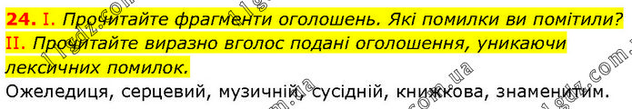 І. Прочитайте фрагменти оголошень. Які помилки ви помітили? II. Прочитайте виразно вголос подані оголошення, уникаючи лексичних помилок. Ожеледиця, серцевий, музичній, сусідній, книжкова, знаменитим.