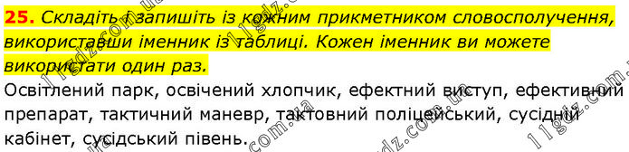 Складіть і запишіть із кожним прикметником словосполучення, використавши іменник із таблиці. Кожен іменник ви можете використати один раз. Освітлений парк, освічений хлопчик, ефектний виступ, ефективний препарат, тактичний маневр, тактовний поліцейський, сусідній кабінет, сусідський півень.