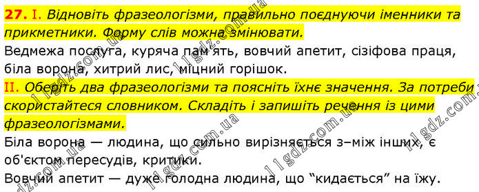 І. Відновіть фразеологізми, правильно поєднуючи іменники та прикметники. Форму слів можна змінювати. Ведмежа послуга, куряча пам'ять, вовчий апетит, сізіфова праця, біла ворона, хитрий лис, міцний горішок. II. Оберіть два фразеологізми та поясніть їхнє значення. За потреби скористайтеся словником. Складіть і запишіть речення із цими фразеологізмами. Біла ворона — людина, що сильно вирізняється з–між інших, є об'єктом пересудів, критики. Вовчий апетит — дуже голодна людина, що “кидається” на їжу.