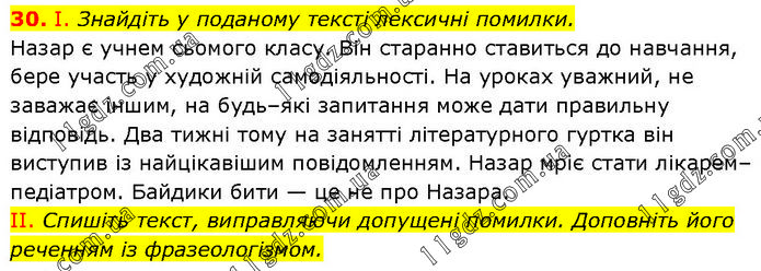 І. Знайдіть у поданому тексті лексичні помилки. Назар є учнем сьомого класу. Він старанно ставиться до навчання, бере участь у художній самодіяльності. На уроках уважний, не заважає іншим, на будь–які запитання може дати правильну відповідь. Два тижні тому на занятті літературного гуртка він виступив із найцікавішим повідомленням. Назар мріє стати лікарем–педіатром. Байдики бити — це не про Назара. II. Спишіть текст, виправляючи допущені помилки. Доповніть його реченням із фразеологізмом.
