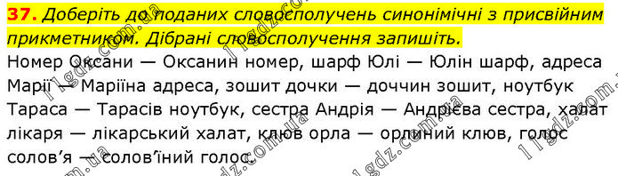 Доберіть до поданих словосполучень синонімічні з присвійним прикметником. Дібрані словосполучення запишіть. Номер Оксани — Оксанин номер, шарф Юлі — Юлін шарф, адреса Марії — Маріїна адреса, зошит дочки — доччин зошит, ноутбук Тараса — Тарасів ноутбук, сестра Андрія — Андрієва сестра, халат лікаря — лікарський халат, клюв орла — орлиний клюв, голос солов’я — солов’їний голос.