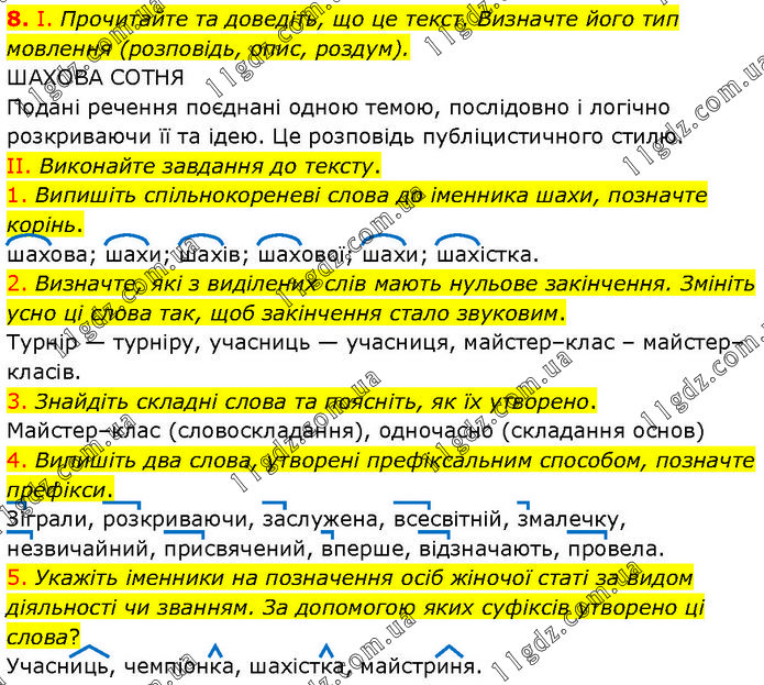 І. Прочитайте та доведіть, що це текст. Визначте його тип мовлення (розповідь, опис, роздум). ШАХОВА СОТНЯ Подані речення поєднані одною темою, послідовно і логічно розкриваючи її та ідею. Це розповідь публіцистичного стилю. II. Виконайте завдання до тексту. 1. Випишіть спільнокореневі слова до іменника шахи, позначте корінь. шахова; шахи; шахів; шахової; шахи; шахістка. 2. Визначте, які з виділених слів мають нульове закінчення. Змініть усно ці слова так, щоб закінчення стало звуковим. Турнір — турніру, учасниць — учасниця, майстер–клас – майстер–класів. 3. Знайдіть складні слова та поясніть, як їх утворено. Майстер–клас (словоскладання), одночасно (складання основ) 4. Випишіть два слова, утворені префіксальним способом, позначте префікси. Зіграли, розкриваючи, заслужена, всесвітній, змалечку, незвичайний, присвячений, вперше, відзначають, провела. 5. Укажіть іменники на позначення осіб жіночої статі за видом діяльності чи званням. За допомогою яких суфіксів утворено ці слова? Учасниць, чемпіонка, шахістка, майстриня.