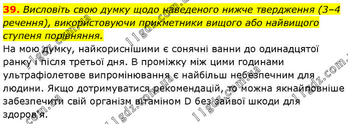 Висловіть свою думку щодо наведеного нижче твердження (3–4 речення), використовуючи прикметники вищого або найвищого ступеня порівняння. На мою думку, найкориснішими є сонячні ванни до одинадцятої ранку і після третьої дня. В проміжку між цими годинами ультрафіолетове випромінювання є найбільш небезпечним для людини. Якщо дотримуватися рекомендацій, то можна якнайповніше забезпечити свій організм вітаміном D без зайвої шкоди для здоров'я.