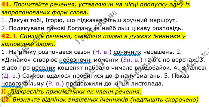 41. Прочитайте речення, уставляючи на місці пропуску одну із запропонованих форм слова. 1. Дякую тобі, Ігорю, що підказав більш зручний маршрут. 2. Подякували панові Богдану за найбільш цікаву розповідь. 42. І. Спишіть речення, ставлячи подані в дужках іменники у відповідній формі. 1. На ринку розпочався сезон (Н. в.) сонячних черешень. 2. «Динамо» створює небезпечні моменти (Зн. в.) та б’є по воротах. 3. Відео про веселих кошенят набрало чимало вподобайок. 4. Віталієві (Д. в.) Сачкові вдалося пробитися до фіналу змагань. 5. Показ нового фільму (Р. в.) продовжили до кінця листопада. II. Підкресліть прикметники як члени речення. III. Визначте відмінок виділених іменників (надпишіть скорочено)