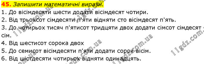 Запишити математичні вирази. 1. До вісімдесяти шести додати вісімдесят чотири. 2. Від трьохсот сімдесяти п'яти відняти сто вісімдесят п'ять. 3. До чотирьох тисяч п'ятисот тридцяти двох додати сімсот сімдесят сім. 4. Від шестисот сорока двох 5. До семисот вісімдесяти п'яти додати сорок вісім. 6. Від шістдесяти чотирьох відняти одинадцять.