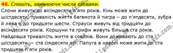 Спишіть, замінюючи числа словами. Слони живуть до вісімдесяти п'яти років. Кінь може жити до шістдесяти, тривалість життя бегемота й тигра – до п'ятдесяти, зубра й лева – до тридцяти шести. Страуси живуть від тридцяти до вісімдесяти років. Коршуни та грифи живуть більше ста років. Найдовша тривалість життя в соколів. Вони доживають до ста шістдесяти — ста сімдесяти літ. Папуга в неволі може жити до ста тридцяти п'яти років.