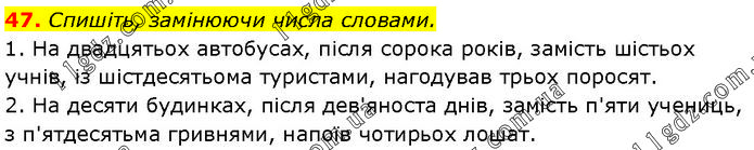 Спишіть, замінюючи числа словами. 1. На двадцятьох автобусах, після сорока років, замість шістьох учнів, із шістдесятьома туристами, нагодував трьох поросят. 2. На десяти будинках, після дев'яноста днів, замість п'яти учениць, з п'ятдесятьма гривнями, напоїв чотирьох лошат.