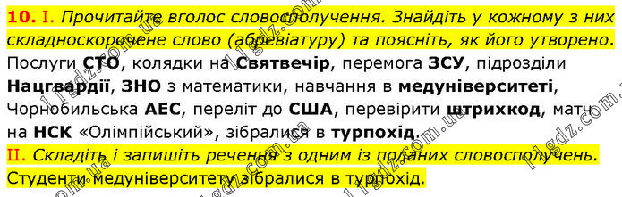 І. Прочитайте вголос словосполучення. Знайдіть у кожному з них складноскорочене слово (абревіатуру) та поясніть, як його утворено. Послуги СТО, колядки на Святвечір, перемога ЗСУ, підрозділи Нацгвардії, ЗНО з математики, навчання в медуніверситеті, Чорнобильська АЕС, переліт до США, перевірити штрихкод, матч на НСК «Олімпійський», зібралися в турпохід. II. Складіть і запишіть речення з одним із поданих словосполучень. Студенти медуніверситету зібралися в турпохід.